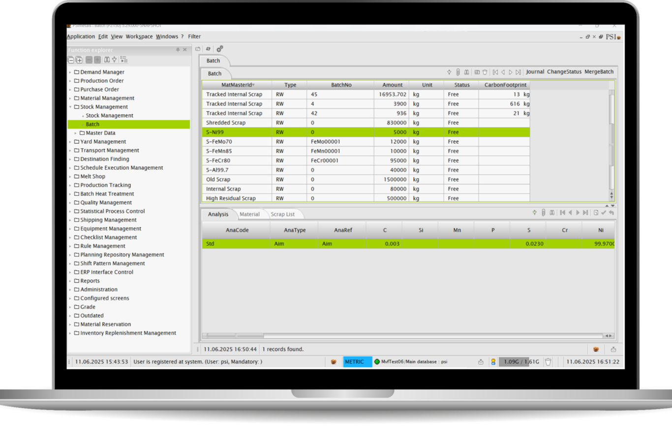 PSImetals delivers optimized scrap management by treating internal scrap as valuable batch material, automatically capturing key production data, and tracking weight, composition, and carbon footprint for every container. With clear visibility into scrap origin and quality, you can recycle efficiently, plan scrap demands, optimize mixes and alloy charging, manage scrap yards, and track consumption across the entire production chain, reducing energy use and lowering your carbon footprint.