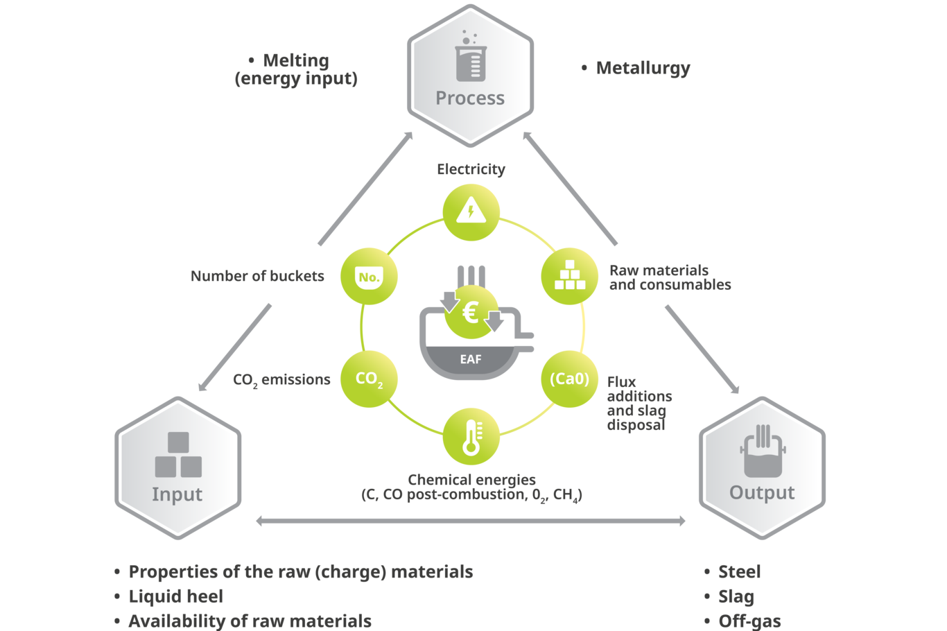 Consideration of energy consumption and CO₂ emissions for optimization of charge and alloy mix, as well as dynamic adaption of input material properties. Raw materials and energy demands, along with resulting CO₂ emissions, are key parameters in rule-based Production Order elaboration.