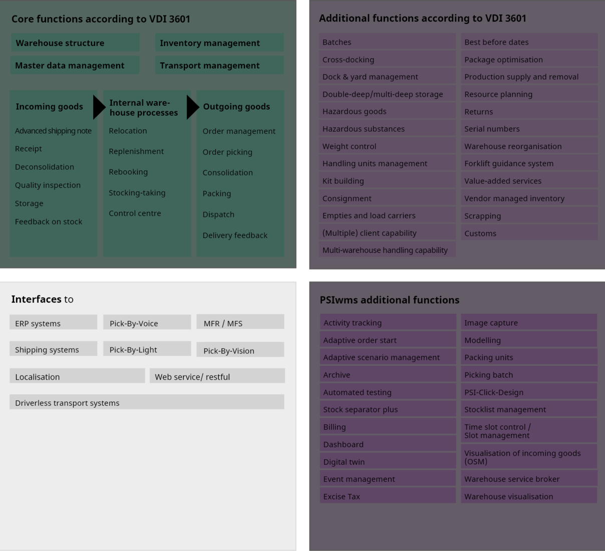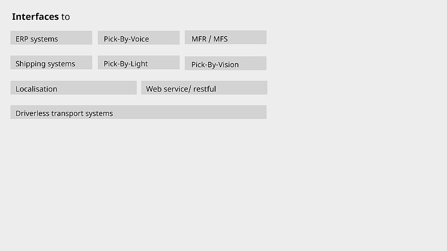 PSIwms provides standard interfaces to high-level ERP systems such as SAP or Navision, adjacent shipping systems, as well as subordinate material flow control systems and picking systems.