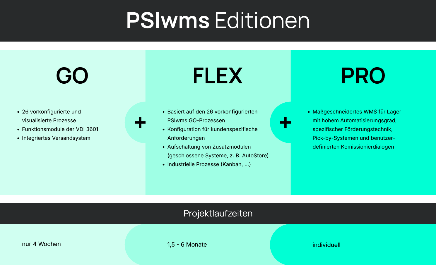 PSIwms bietet drei verschiedene Editionen GO, FLEX und PRO, die auf unterschiedliche Bedürfnisse und Komplexitäten zugeschnitten sind.