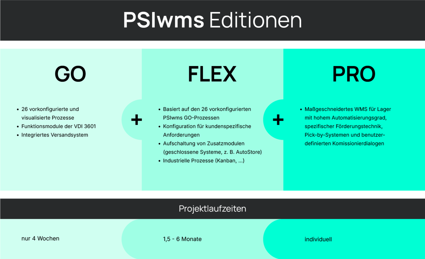 Verschiedene WMS Editionen PSIwms gibt es in drei Editionen (GO, FLEX und PRO) - kundenorientiert, hochflexibel und benutzerfreundlich für maximale Performance.