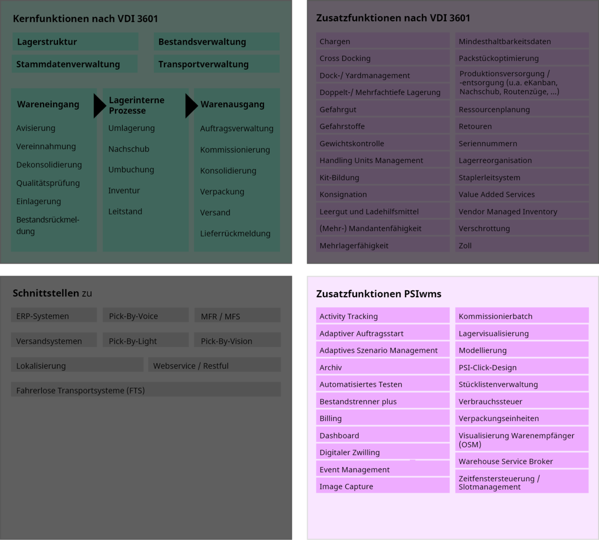Neben den nach der Richtlinie VDI 3601 vorgesehenen Zusatzfunktionen eines WMS, beinhaltet PSIwms darüber hinaus weitere spezifische Zusatzfunktionen zur Steuerung von Lägern.