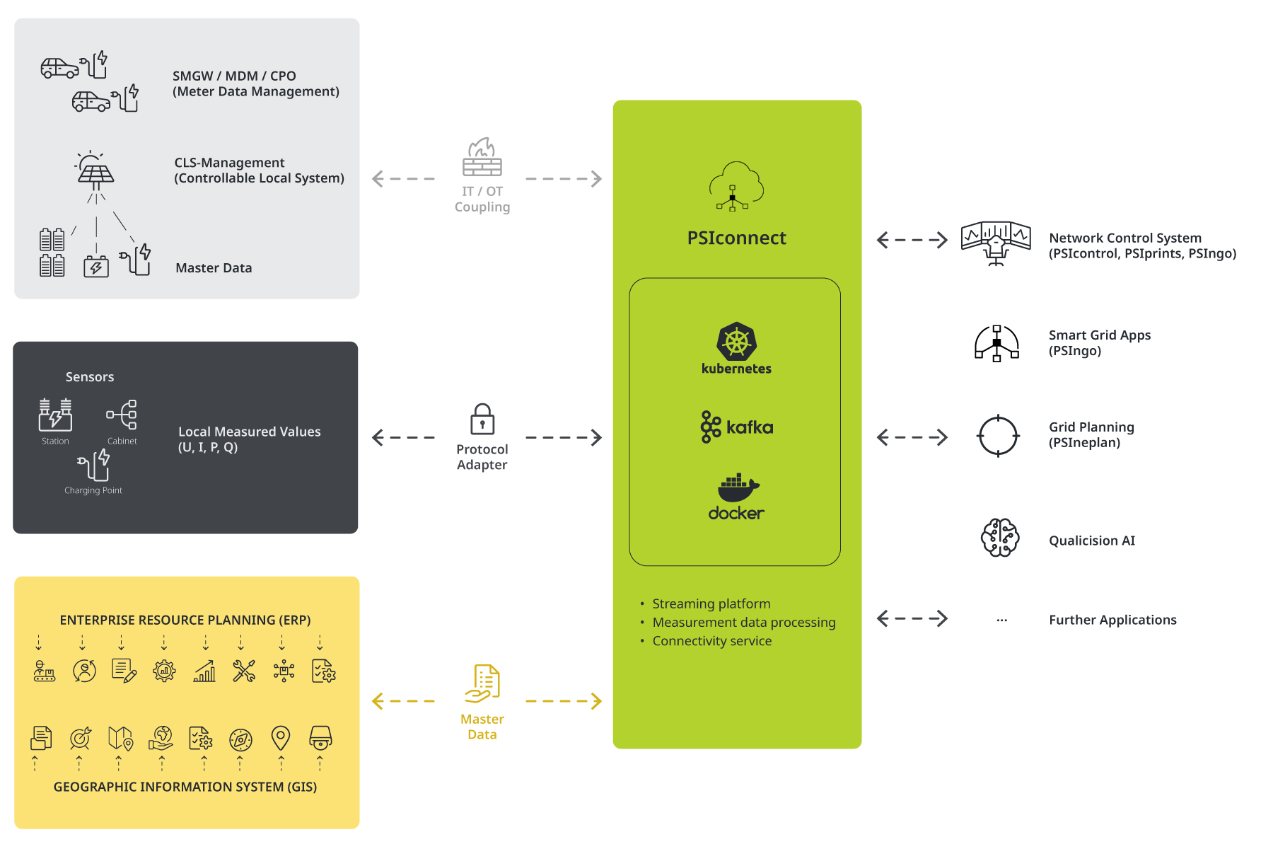 PSIconnect steht als Drehscheibe für die Netzdigitalisierung im Mittelpunkt. Die Architektur lässt sich in drei Abschnitten beschreiben.